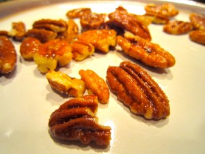 2. To prepare pecans: In frying pan, melt butter on medium heat, then add pecans. Stir to coat in melted butter, then cook for 2 minutes. Remove from heat and sprinkle with granulated sugar. Set aside.