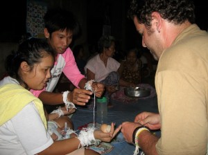 Later we moseyed over to a neighbour’s house where a young couple was celebrating the birth of their first born – a Thai baby shower, I suppose. As is customary, the entire village was present to impart well-wishes to the new family and their child. Dozens of colourful food platters littered the floor and we found a place, legs folded, closest to the most appealing dish – laap gai. We were quickly assailed by doting women who began tying yellow and white beaded strings around our wrists for good luck. We were prompted by eager, helpful women to form one-handed prayer positions with the free hand during the process and were then handed strings of our own to reciprocate the act to others, a spiritually symbolic tit for tat.  By the end of the night I counted 15 string bracelets on both wrists. I noticed the mother with the newborn was also festooned with string, like a garland, though unique to her was that she had in her hand a hard-boiled egg without a shell and a fistful of sticky rice. I never found out the purpose of her tightly holding onto these food staples, though I imagined they were representative of health, wealth and prosperity. Or that she had started eating and had misplaced her dish.