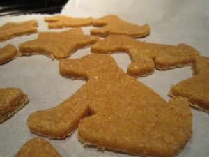 3. Remove the mixture and combine into a ball, then place on lightly floured work surface. Using a rolling pin, flatten out the dough to ¼ inch thickness and use cookie cutter shapes to cut out desired shapes. For some reason I had a cookie cutter in the shape of a dog, which I admit is strangely cannibalistic to feed to a dog, but it was nice to look at.