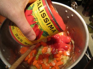 1. In a large soup pot, heat the oil on medium heat until hot. Add the chopped onions and stir for 2 minutes. Then add the garlic and stir both until the onions are translucent and soft. Add carrots and stir the mixture for 5 minutes more.