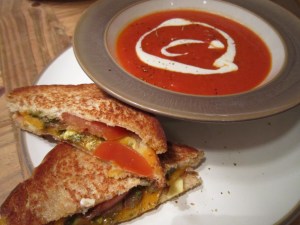 Although tasty and inexpensive, Campbell’s soup was a little too easy tonight, so I tried to pull together something homemade that tasted close enough. I also love grilled cheese and have recently started putting a dab of pesto in the middle for some extra kick and have been experimenting with different cheeses to venture out of my Cheddar comfort zone. I didn’t have any regular pesto on hand, but at the back of the fridge was a jar of homemade pesto made from nettle plants that a friend from Saltspring Island had given me as a gift. For serving, call me crazy, but I get real enjoyment out of dipping my grilled cheese into the soup and then taking a bite of it when it’s warm and soggy. The perfect Sunday meal for eating while curled up on the couch in front of the TV.