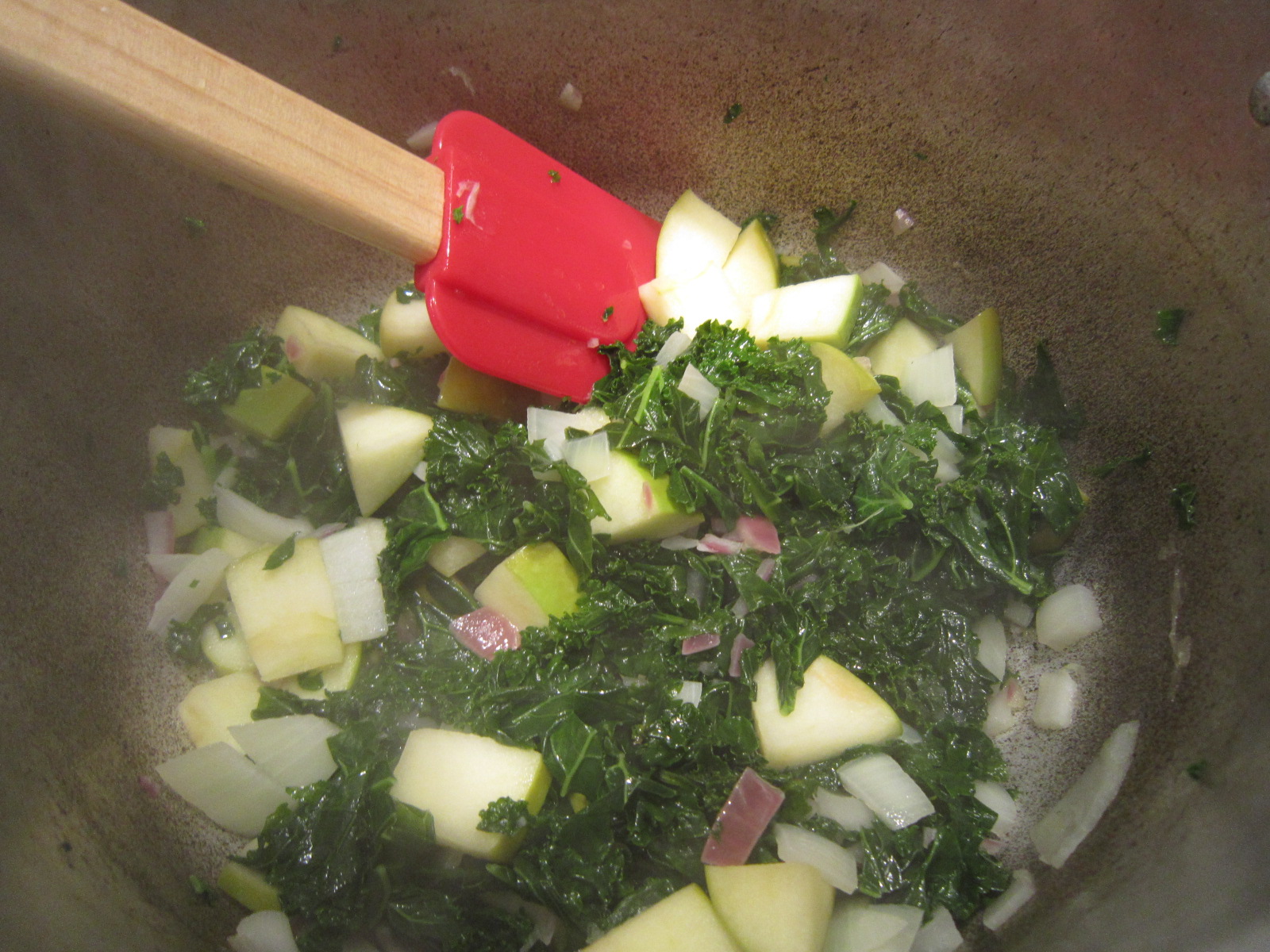 1. Heat the oil and butter in a large soup pot or dutch oven. Add the kale and onions and stir together, tossing with the oil for about 2 minutes.