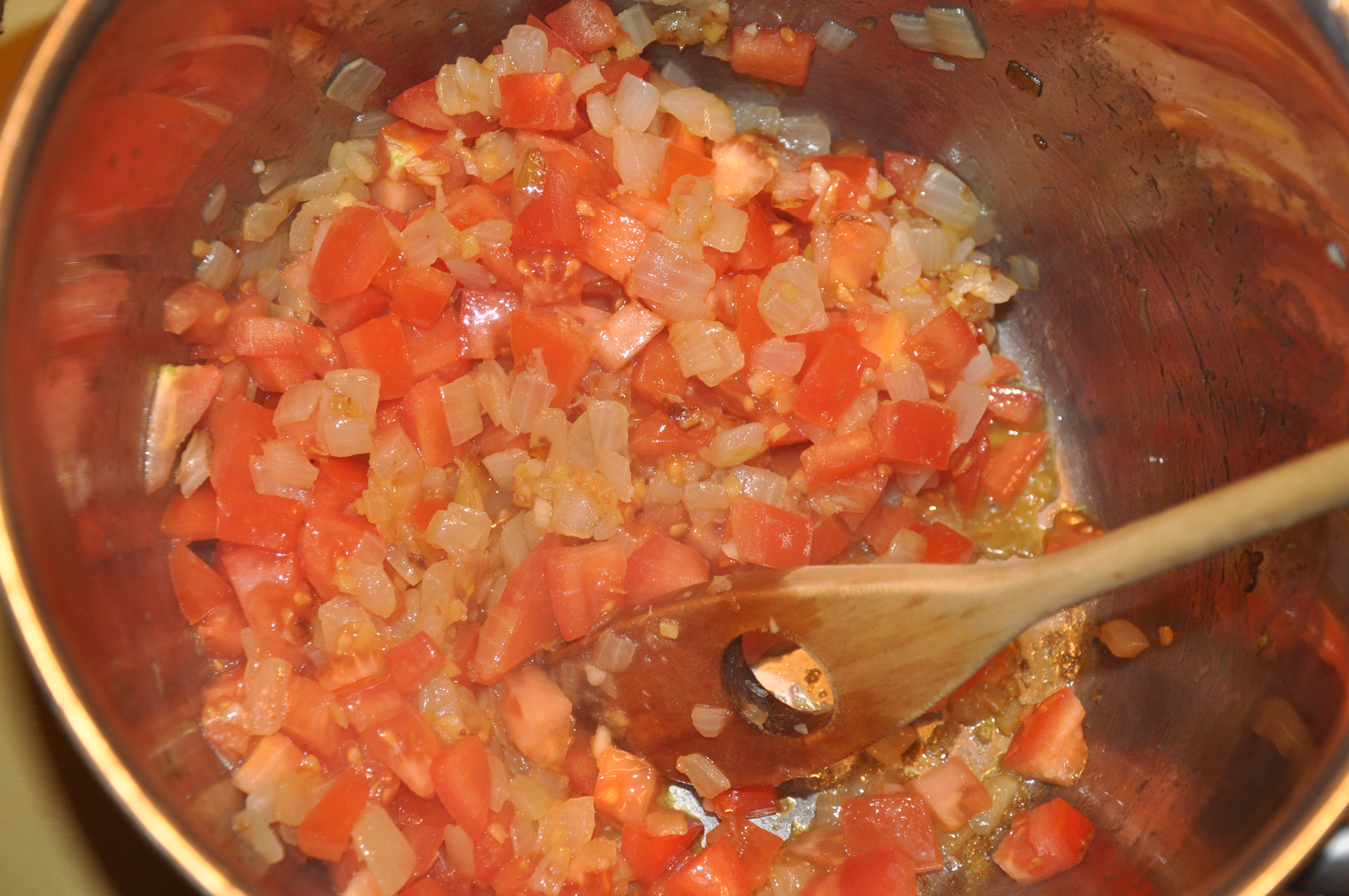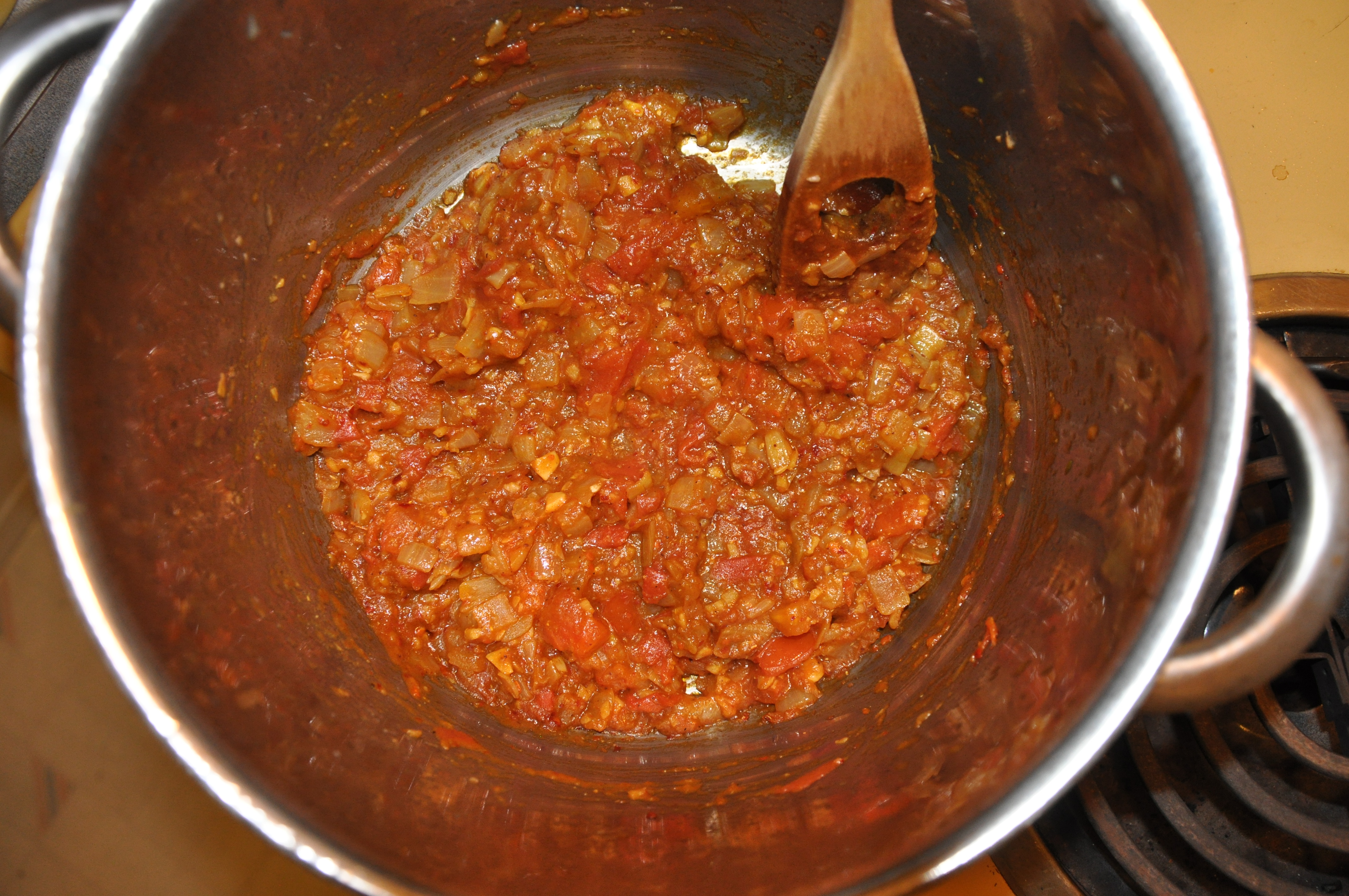 - Once onion mixture is golden, add in tomatoes and simmer down until much of the moisture has left the tomatoes. This should start to form together and thicken after 5-10 minutes.