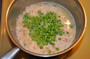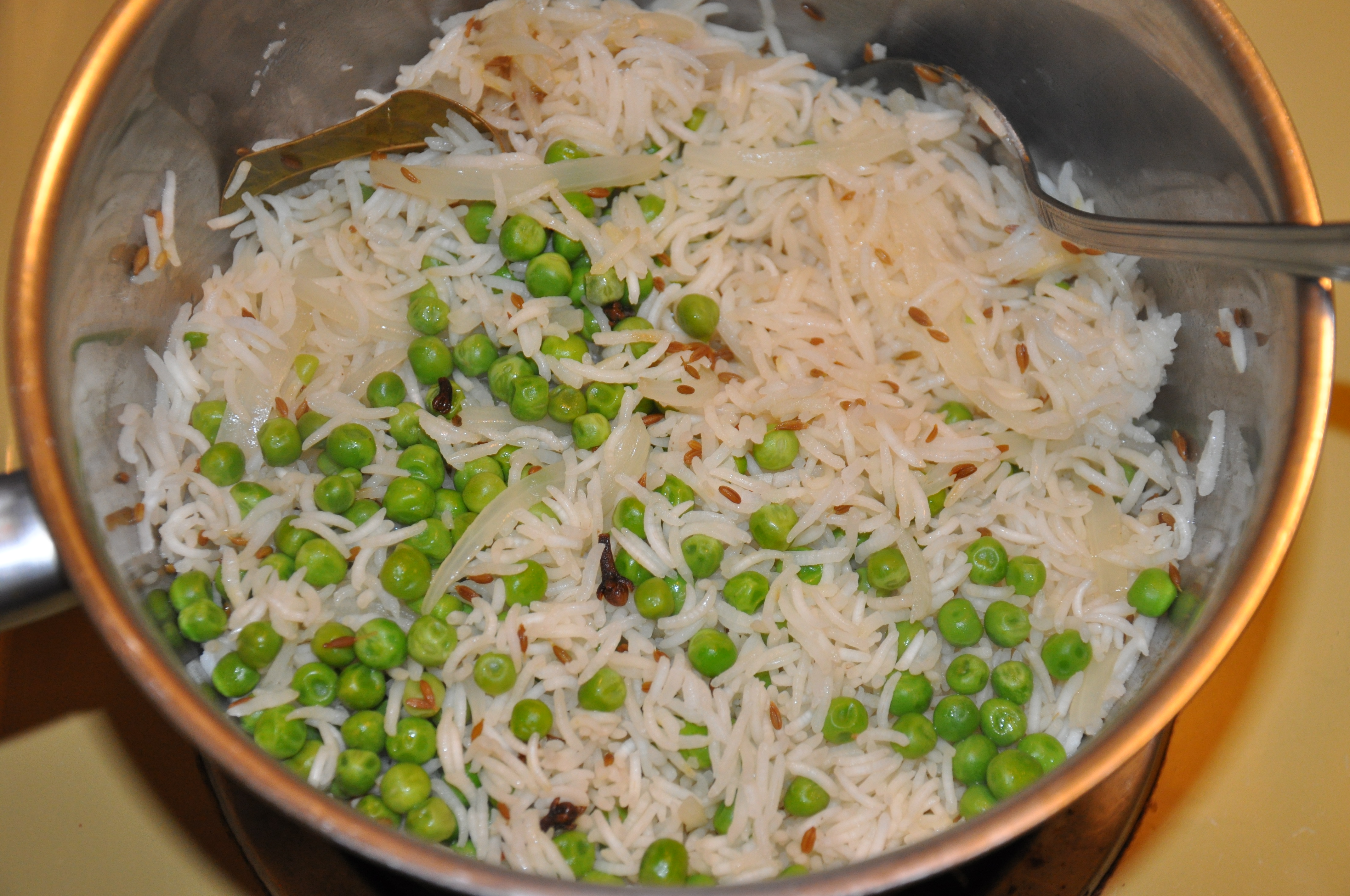 - Add rice and peas and stir to thoroughly coat the rice with the flavours. Add water and bring to a boil. Reduce heat to low and gently simmer until water absorbs completely. Approximately 15 minutes. Remove lid and gently create a small well in the centre to peer down to the bottom of the pot with a fork. If the water is gone and rice is just starting to stick, it is done. Fluff with a fork and serve.