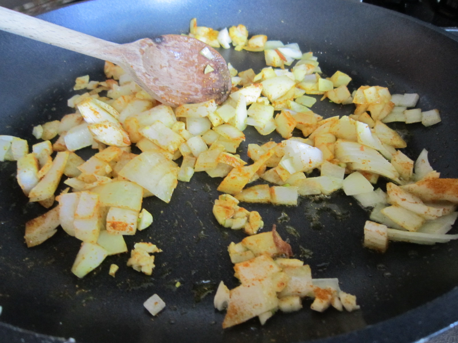 1. In a large frying pan or saucepan, heat up the oil on medium-high heat. Add the curry powder with the onions, garlic and ginger and saute until the onions are translucent and the curry powder is heated and beautifully fragrant.