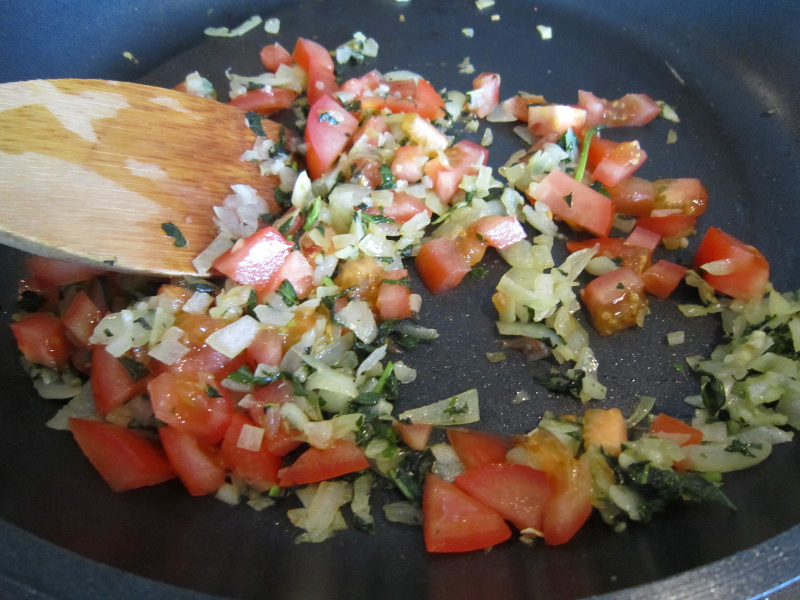 3. In a large skillet or frying pan, heat the oil over medium heat. Saute the onion and garlic until soft, about 3 minutes, then add the chopped basil and stir for another minute. Add the chopped tomatoes and stir for another 5 minutes.