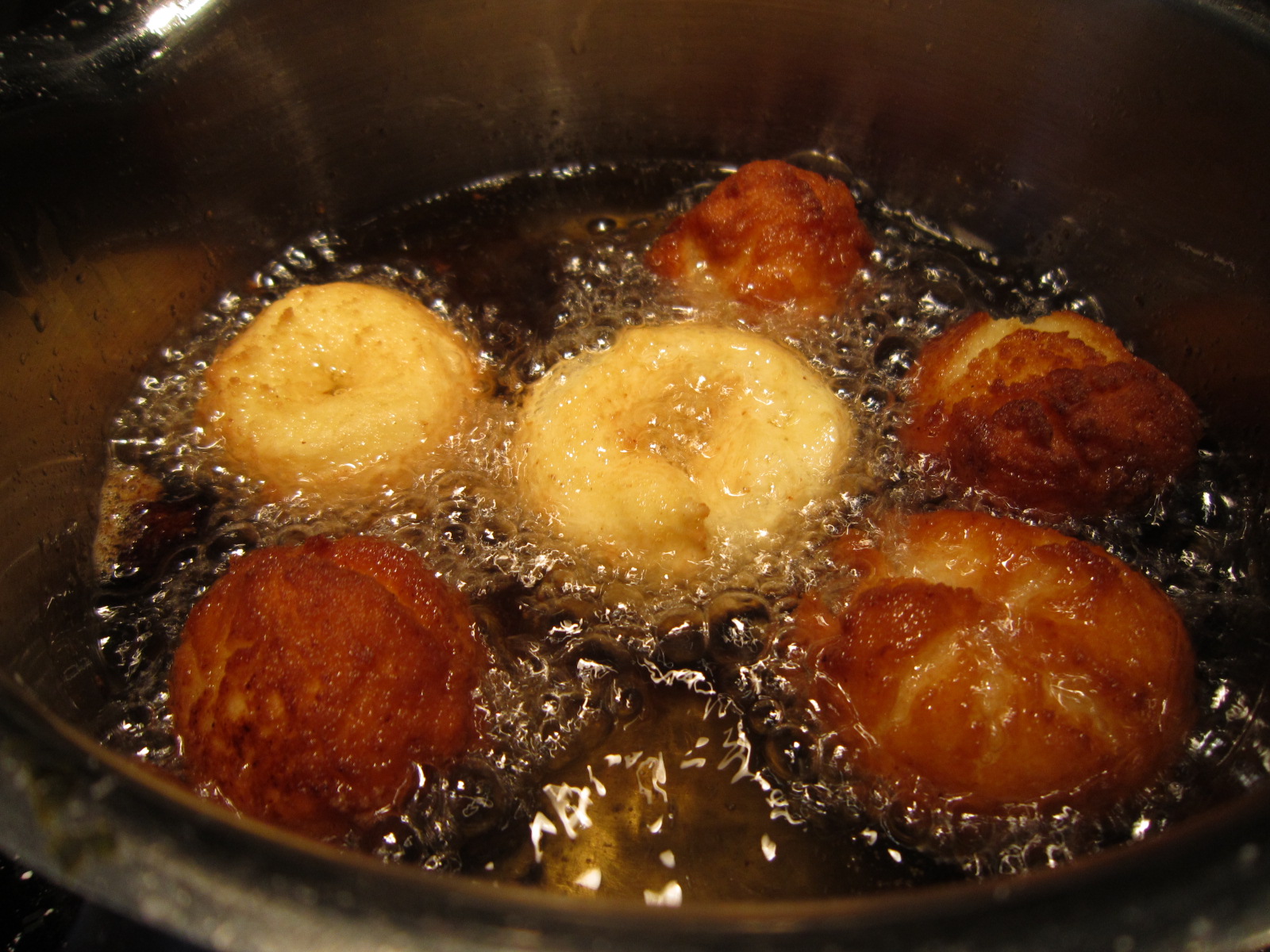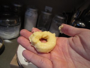 3. Once the oil is hot, carefully drop batter by the tablespoon into the oil, if making doughnut holes. If making mini round doughnuts, roll a tablespoon and a half of dough between your hands, attach the two ends of the roll together into a ring shape, then carefully drop this into the oil.