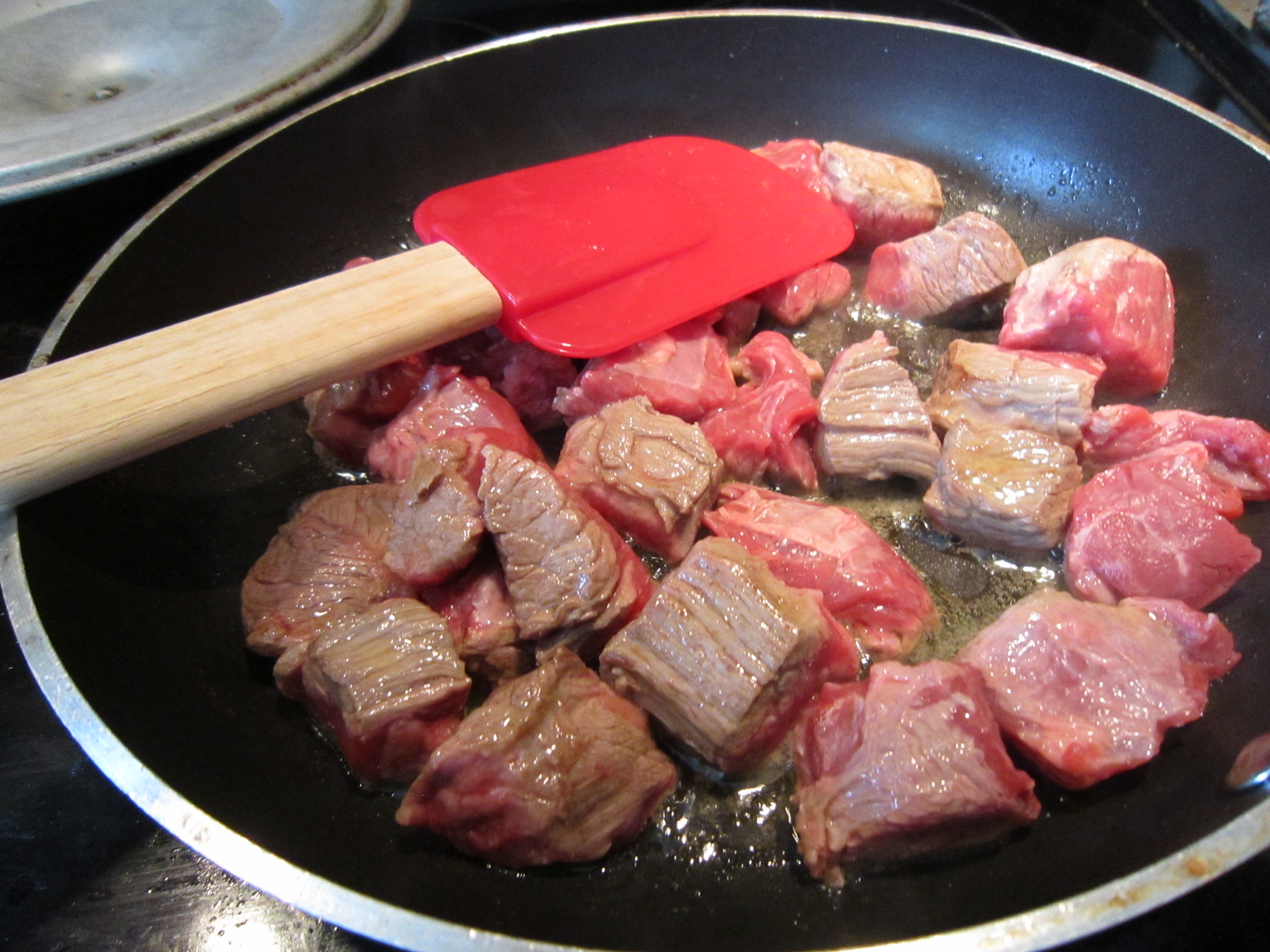 2. In a large saucepan on high heat, add half the butter and oil and then begin to brown the meat in small batches. Don’t cook the meat all the way through, just until the outsides are no longer red (3-5 minutes per batch). When all the meat is browned, set aside, though keep the oil in the pan.