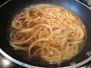 3. Bring down the heat to medium, then add the remaining half of butter and oil, and soften the sliced onions for 5 minutes.