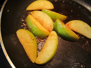 5. When the meat is nearly finished cooking, wash the apples (keep the skins on for added tartness), remove core, then cut the apple into eighths. In a large frying pan heat the 2 tbsp butter and cook the apples for 12 minutes, turning frequently. During last 5 minutes, drizzle the apples in honey and sprinkle with cinnamon, then continue cooking until finished.