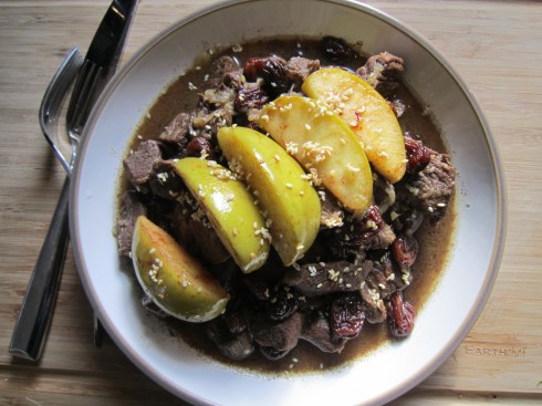 I don’t eat a lot of beef at home, so tend to lean more towards cooking chicken tagine when in the mood for Moroccan. If I have the time, however, I thoroughly enjoy the robust taste of beef tagine cooked to slow perfection with raisins, honey and middle eastern spices. I remember once seeing this dish served with sauteed apples glazed with honey and cinnamon, to lend a pleasant tartness to the dish, so I’ve duplicated it here. I didn’t use a tagine to cook this dish, but you could have just as easily cooked this in a tagine in the oven or stovetop, instead of in a large saucepan.