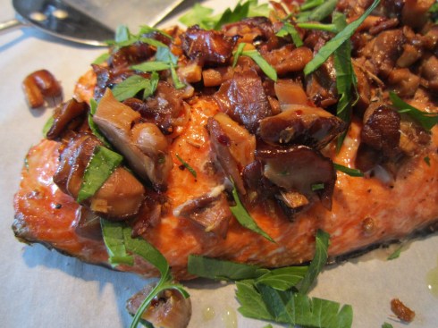 During my last year of high school I was given a shiitake log by someone who knew of my love of growing things. These logs are pretty remarkable if you’ve never seen one before. It is a small log that has been coated, I’m guessing, by spores from this delicious fungi. After a few weeks sitting in a cool damp place, mushrooms begin to grow on and off for several months. I hadn’t really been a huge lover of fungi until then, but there is something wonderfully meaty and exotic with shiitake. Ranging anywhere from $4 to $8 a pound, I don’t often buy these expensive ingredients; although they are always a welcome treat in my kitchen, especially in this ginger-shiitake glaze paired with salmon which I know you’ll love.