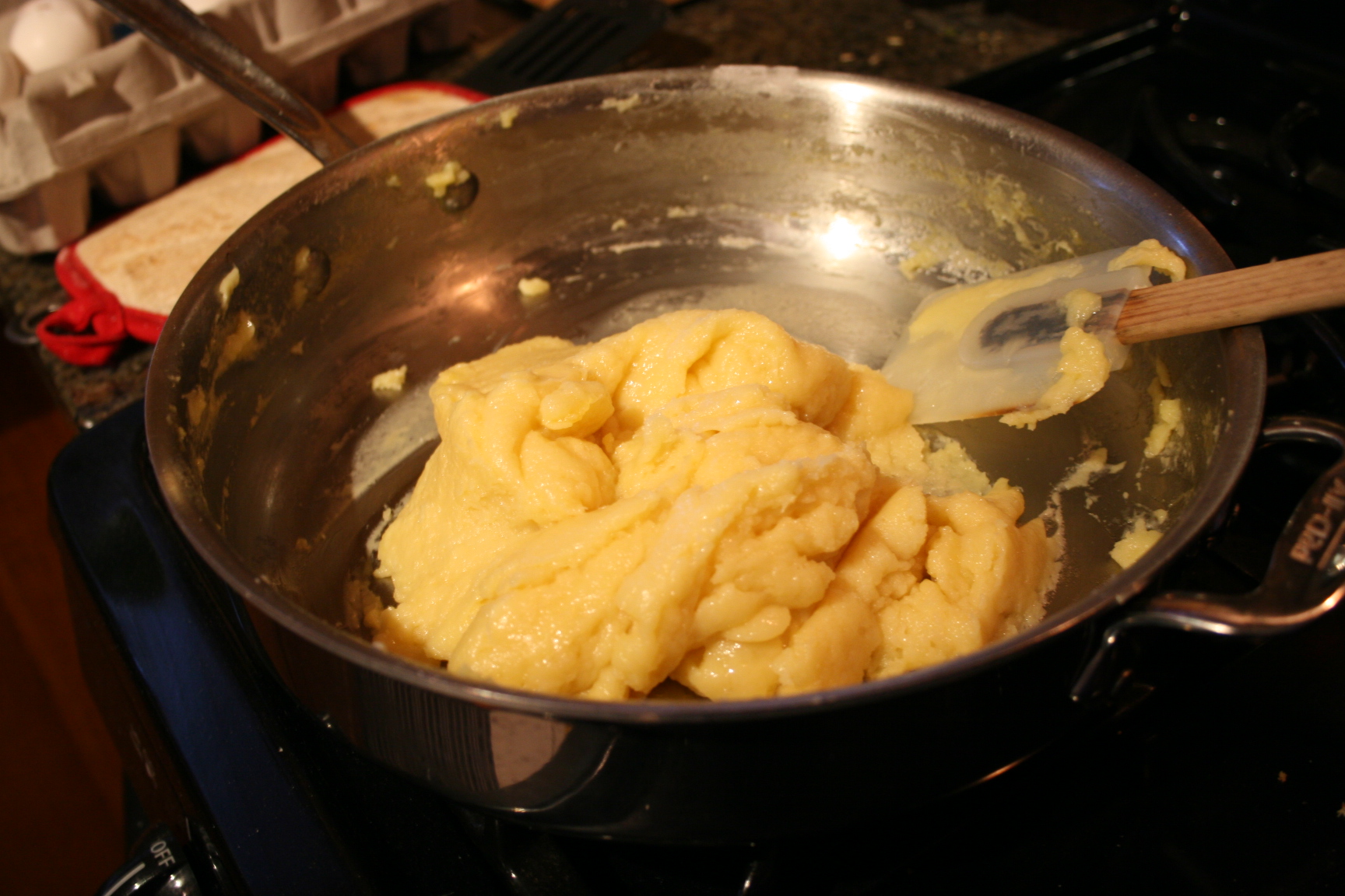 - Add eggs one at a time, beating each one in well to avoid getting scrambled eggs:) Remove from heat once the dough is smooth and well-mixed.