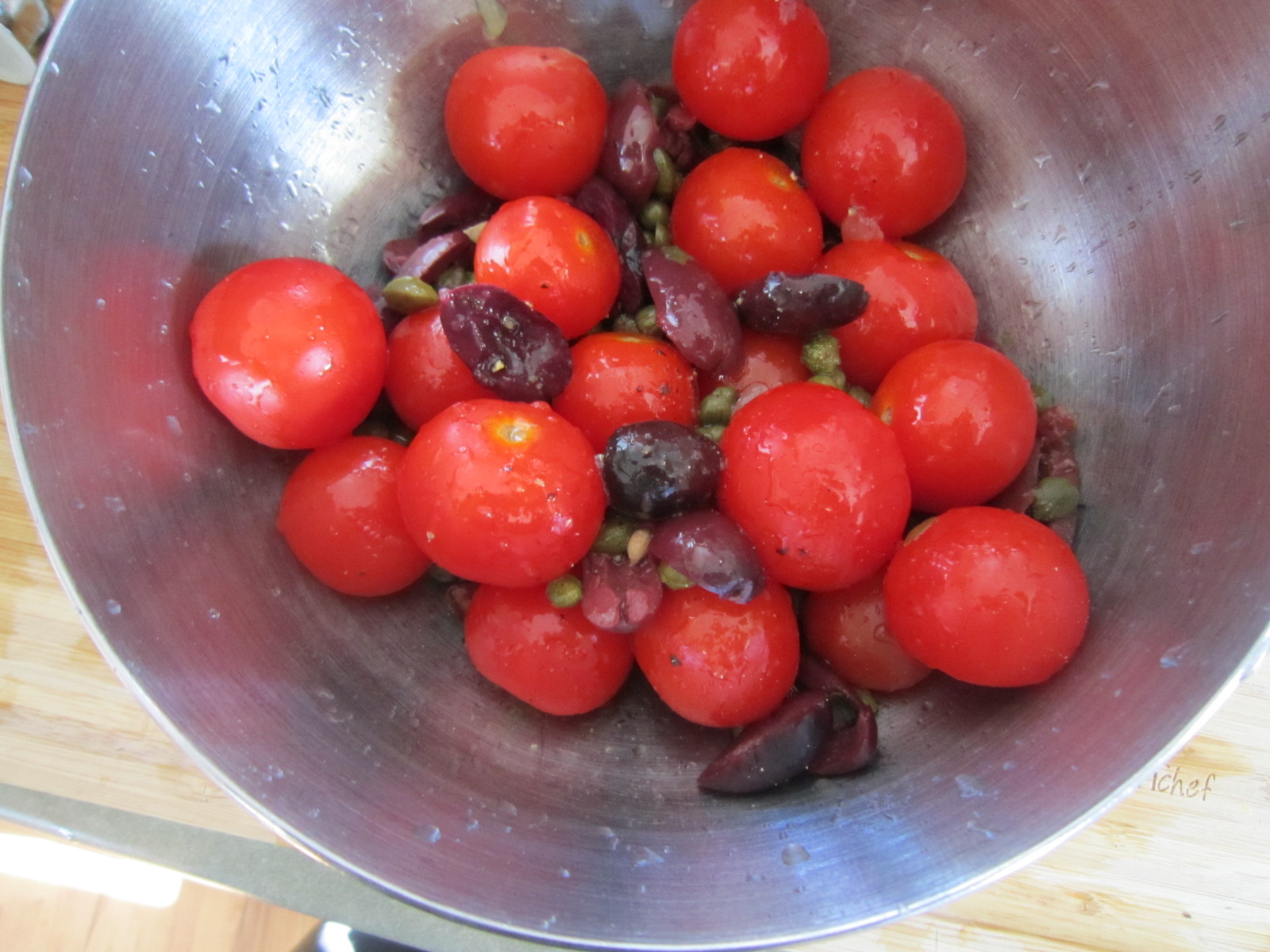 2. Mix together the tomatoes, olive halves, capers, 2 tbsp of the olive oil, lemon juice and wine in a medium bowl.