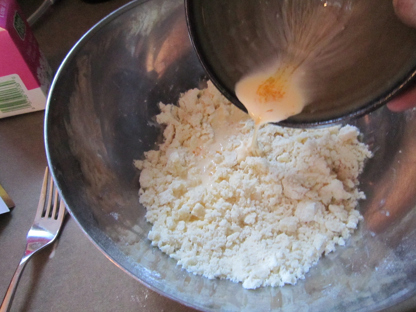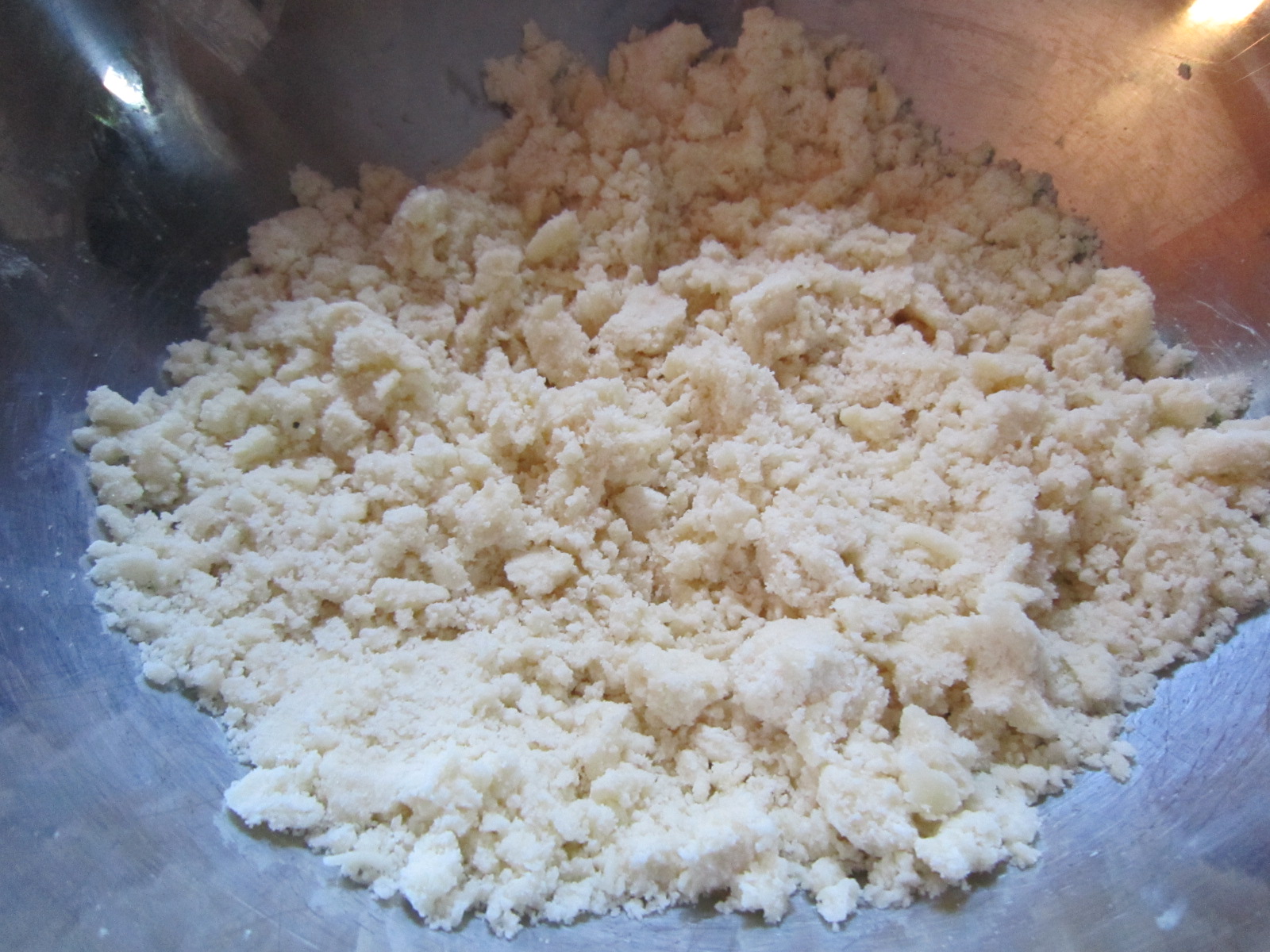 1. Combine the dry ingredients in a large bowl, then stir in the small cubes of butter. You can use two knives, in a criss-crossing motion, to cut the butter into the flour, or if you prefer you can use your hands for mixing. Mix until it holds together when you press it in your hands (about 2 minutes).