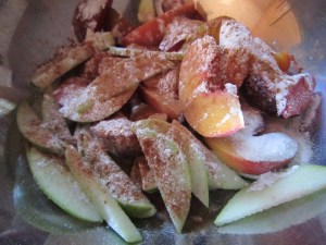 2. In a medium bowl, toss the sliced fruit with the sugar, flour (for thickening) and ground cinnamon until the powder is dissolved.