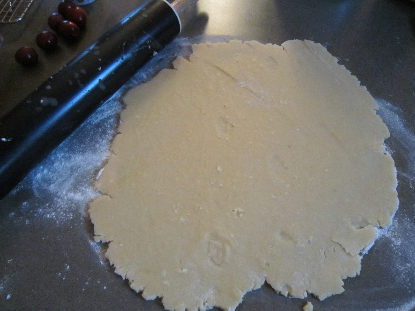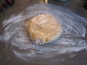3. On a sheet of plastic wrap, place the dough and then form it into a flattened disk roughly 4 inches across – doesn’t have to be precise. Wrap it in the plastic, then stick it in the fridge for 15 minutes so it will be easier to work with when rolling. In theory.