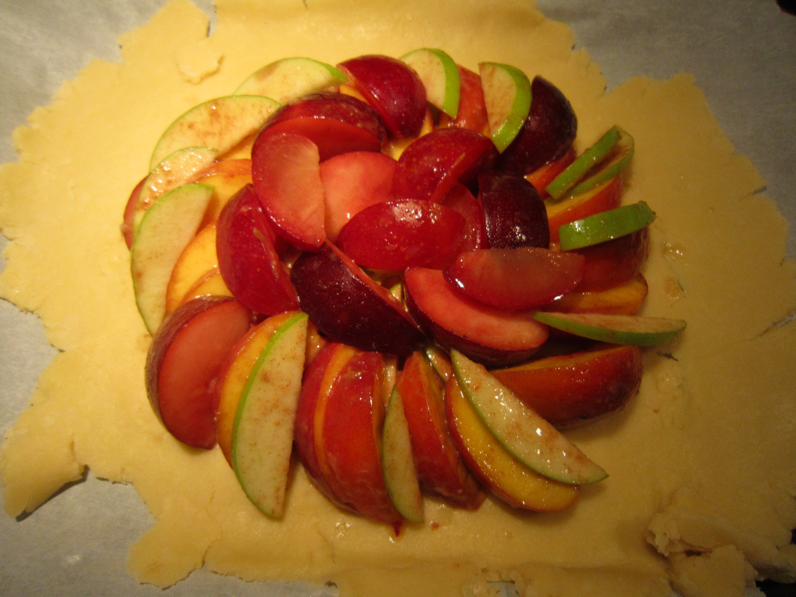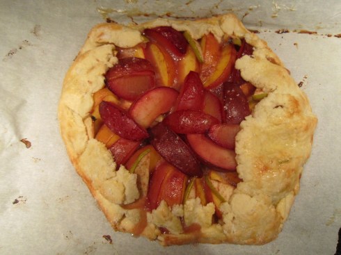 As a filling, I used plums, peaches and granny smith apples, but you can create these tarts using any combination of fruits, I’m sure, including blueberries which have just come in season here in the Pacific Northwest. Be sure to serve the galette warm with a generous dollop of creme fraiche or vanilla ice cream and you’ll be guaranteed an invite again to the next potluck.