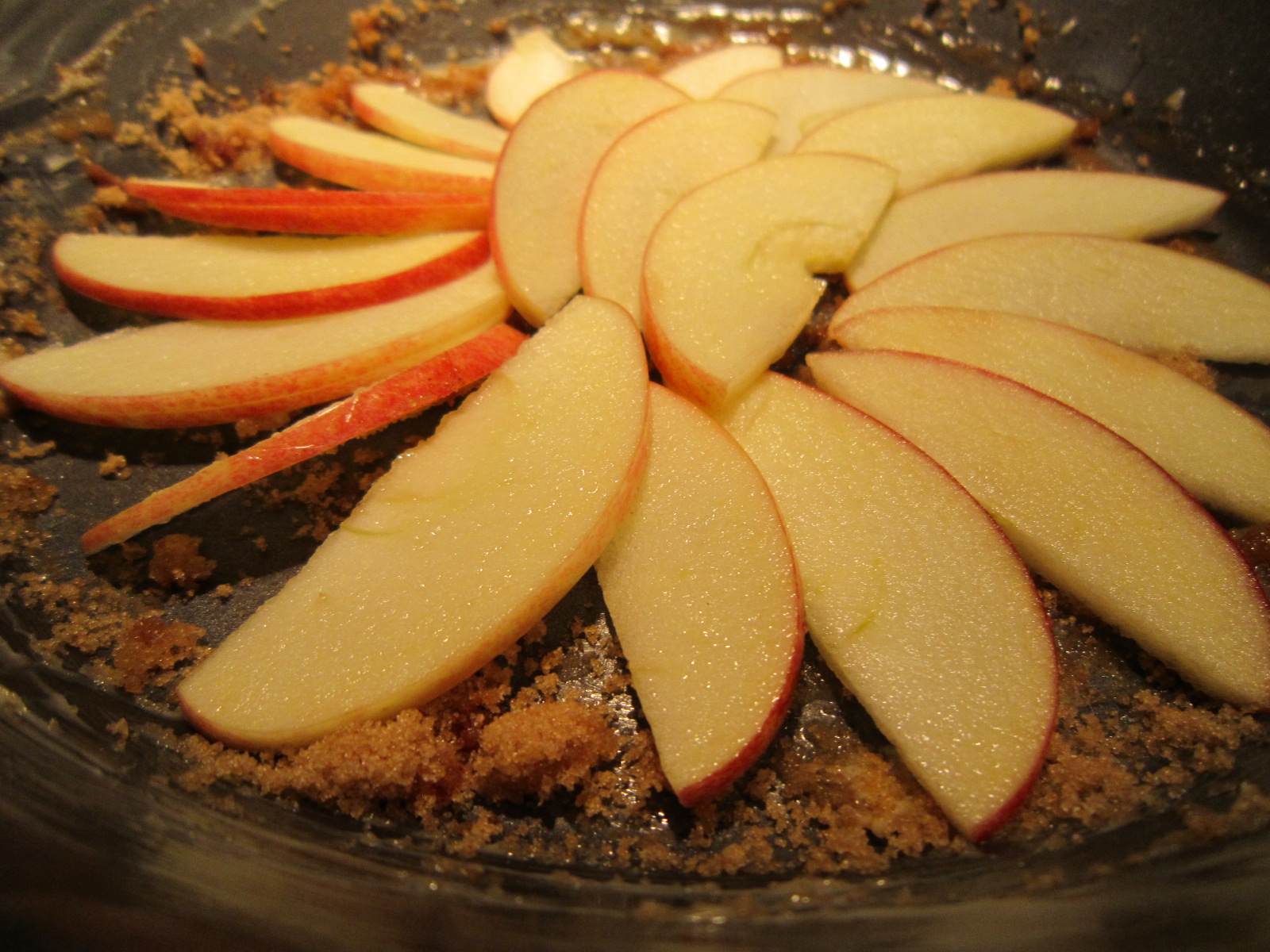 2. Place the sliced apples along the bottom of the pie dish.