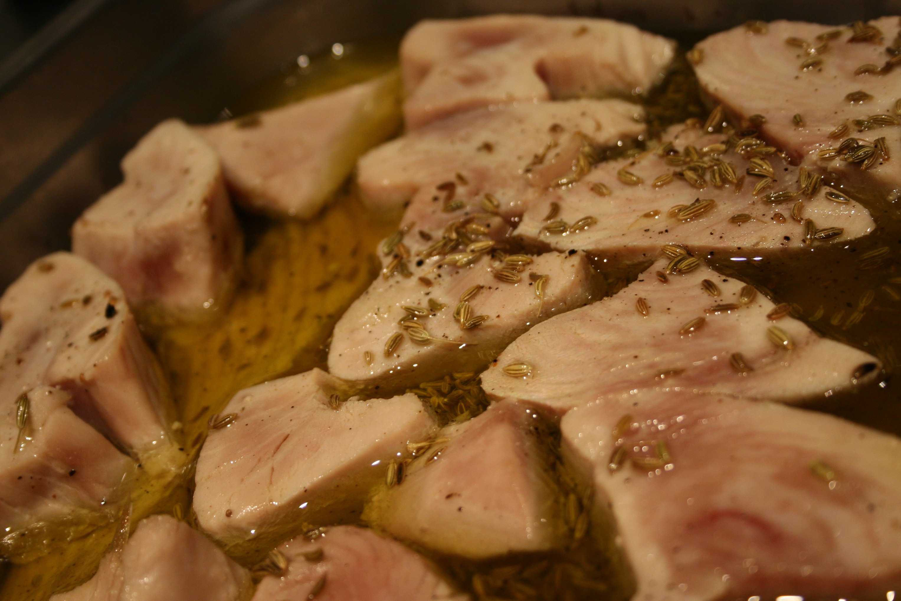 Accompanying the gravlax on this dish were prawns that had been soaking overnight in a beautiful chili-lime marinade and tuna flanks with fennel seed that at first glance appeared to be sitting in a tub of olive oil. Bruce explained the technique for preparing the tuna. Normally one would sear tuna briefly on all sides for under a minute. In this case, however, he used hot olive oil poured onto the fish to cook it. He heated a jar of olive oil that he had previously used for preserving lemons over several months and that were now infused with a mellow citrus flavour. Pouring this over the fish not only partially cooked the fish, but transferred the lemon taste to the tuna. He then rubbed each piece of fish with local sea salts and fennel seed for a subtle hint of anise.